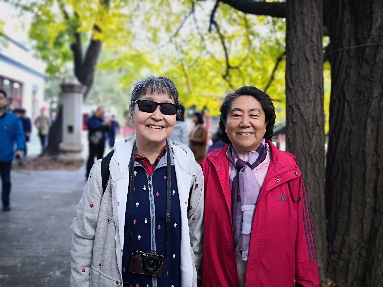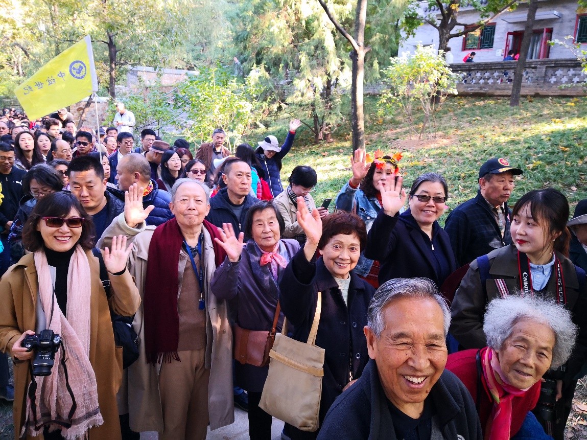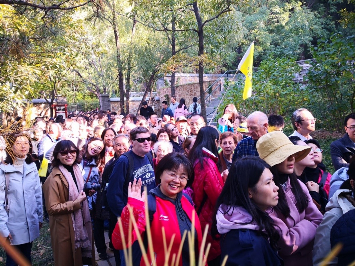 秋日的暖阳伴随着习习秋风,晴空朗朗、明净秀丽的山间使人心情格外舒畅,离退休老师们的脸上也洋溢着欢欣的笑容。十月的香山,红叶黄花秋意正浓,漫山的枫林、银杏与秋菊构成了一派醉人的美丽秋色。老师们纷纷驻足观赏,拍照留念。碧空万里,和风阵阵,在山间呼吸着温润新鲜的空气,远眺金秋阳光下的层林尽染,让人仿佛忘记了城市中的喧嚣与纷扰。参观过程中,老师们拾级而上,相互鼓劲,互相照顾。87岁的俄语系退休教师徐稚芳老师、84岁的东南亚系退休教师郭秀芸老师也跟随着大部队一起前进,老师们个个神清气爽,谈笑风生,秋游队伍其乐融融。