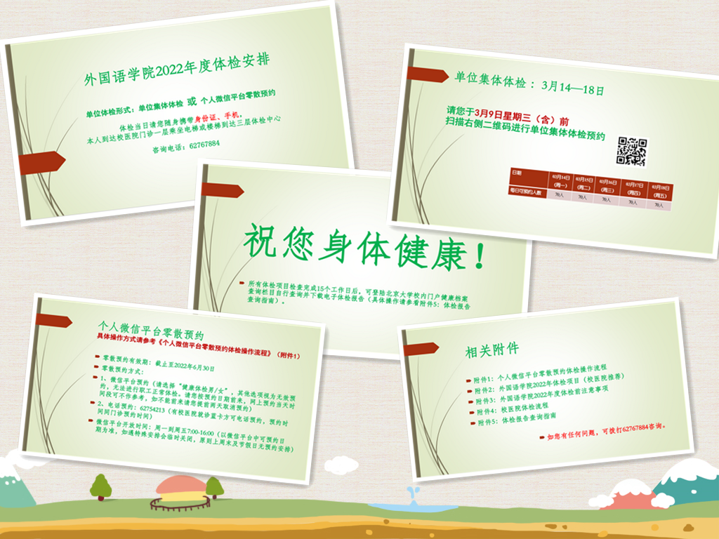 2022年春季学期伊始,经过与校医院的多次沟通协商,新利·体育工会开始着手组织学院全体教职工进行本年度的体检工作。本次体检采取学院集体体检和个人微信平台零散预约相结合的方式,学院老师可根据自己的时间安排进行自由选择。集体体检时间为3月14—18日,选择集体体检的老师通过扫描微信二维码进行报名。因个人原因未能参加学院集体体检的老师,可通过个人微信平台进行零散预约,零散预约有效期至2022年6月30日。不管是学院集体体检,还是个人零散预约,学院工会都为老师们提供了清楚、便捷的操作流程,并提供学院工会相关电话作为咨询热线。截至3月25日,通过校医院发来的数据,我院已有200余名教职工完成了今年的体检工作。