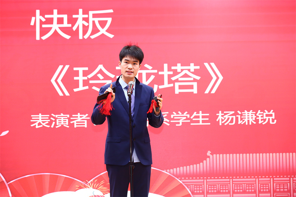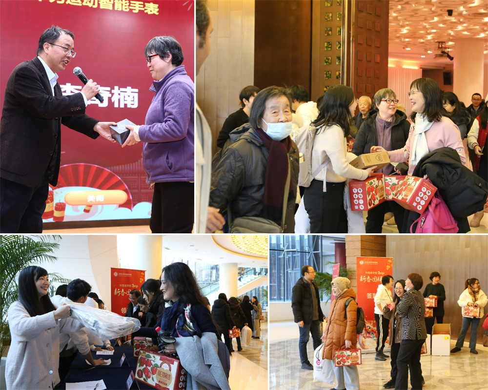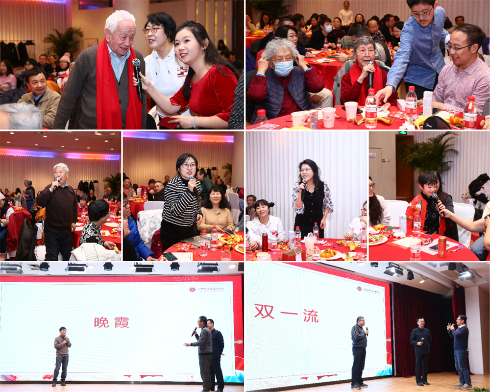 团拜会还安排了丰富多彩的文艺表演和互动环节。日语系同学杨谦锐带来快板《玲珑塔》,伶俐的口齿、顿挫的调子、脆快的板声引得掌声连连。英语系研公英副教授程英演唱歌曲《春风十万里》,用美声带领观众饱览祖国大好河山。日语系博士后王天驰、向伟带来能乐选段《清经》,展现了日本传统戏剧之美。朝韩语系外教朴智娟和她的学生共同演唱韩语歌曲《我对于你,你对于我》,温暖人心的曲调展现出双向奔赴的师生情,令人动容。伴随着俄语系教授查晓燕和特邀嘉宾邹京力老师悠扬的手风琴声,英语系研公英教授李淑静和俄语系副教授张海燕带来经典英语歌曲《雪绒花》和经典俄语歌曲《纺织姑娘》。欣赏着女声二重唱的动人旋律,观众的心情也变得温暖而幸福。语言所助理教授郑萱带来吉他弹唱《岁岁》,轻柔的吉他声与感情充沛的歌声相融合,让歌中蕴含的情感更具感染力。语言所长聘副教授胡旭辉之子胡晋嘉小朋友为大家带来古筝演奏《琵琶语》,郑萱以莲花鼓伴奏,清丽婉转的金石丝竹之声如清泉缓缓流泻全场,滋润听众心田。南亚学系副教授姜永红深情演唱歌曲《如愿》,表达了一代人的愿景,也传递出感动与力量,激励我们去传承、去拼搏。即将退休的语言所教授高一虹为大家带来舞蹈《手之语:花开花落》。纤巧的手法与身法、步法巧妙结合,优雅、轻柔的中国古典舞身韵让人心旷神怡。画风一转,英语系大学英语退休教授黄必康高亢嘹亮的男高音划破长空,慷慨激昂地演唱《沁园春·雪》,雄浑的嗓音和精湛唱功令人心潮澎湃。