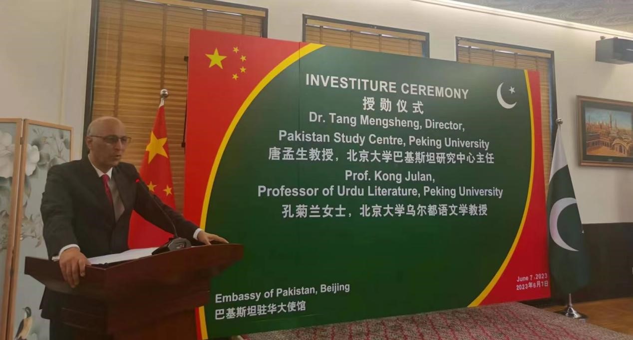 仪式由奏响中巴两国国歌开始,随后现任巴基斯坦驻华大使莫因·哈克代表巴基斯坦政府致辞。他表示,巴中两国友谊源远流长、历久弥坚,是全天候战略合作伙伴和“铁哥们”;在两国友谊建立和加深的过程中,像唐教授、孔教授这样的专家学者所做出的贡献非常重要。哈克大使简要回顾了两位老师的在巴基斯坦的学习与工作经历及学术方面的成就,称赞他们50年来在乌尔都语教学科研、人才培养、中巴人文交流等方面的重要贡献,为促进和加强巴中两国友谊发挥重要作用。他强调,唐孟生教授、孔菊兰教授是深化中巴文化交流和教育合作的热心建设者。当下两国人员往来、旅游合作和文化交流日益深入,希望两位教授与北大同仁一道,持续推动巴中教育合作提质升级、加强民间友好交流,巩固两国友谊纽带。