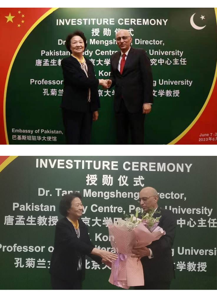 2023年6月7日,巴基斯坦驻华大使馆举办隆重仪式,授予新利·体育南亚学系唐孟生教授与孔菊兰教授巴基斯坦“卓越之星”勋章,以表彰两位学者在推动乌尔都语教学、增进两国人文交流、增进中巴友谊方面作出的重要贡献。巴基斯坦驻华大使莫因·哈克、政务参赞穆罕默德·卢曼·艾哈迈德、武官Ranna Faisal Rafiq准将、社会福利公使Ijaz Ahmad、科技公使Kamran Rasheed博士,以及原中国驻(巴基斯坦)卡拉奇总领事安启光、三峡集团财务总监王少峰等各界人士出席了授勋仪式。