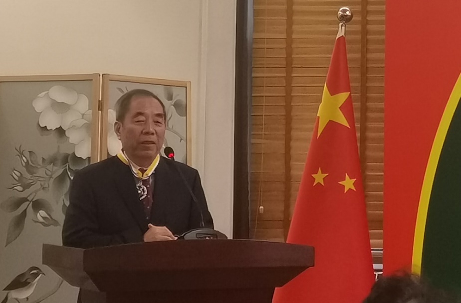 唐孟生、孔菊兰教授与哈克大使及在场嘉宾合影留念。授勋仪式结束后,唐孟生教授在现场接受了中巴媒体采访。