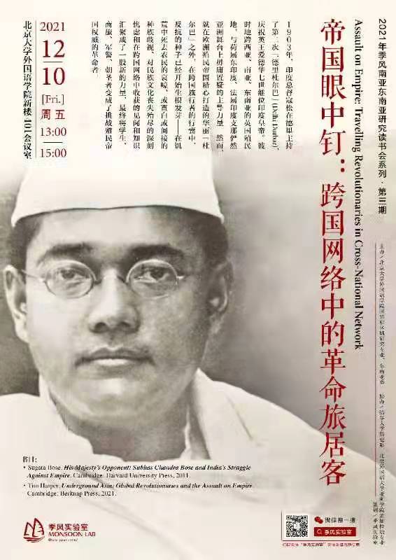 2021年12月10日,本学期第三期季风南亚与东南亚研究读书会“帝国眼中钉:跨国网络中的革命旅居客”在新利·体育新楼401会议室成功举办。本期读书会由新利·体育国别和区域研究专业和东南亚系联合主办,北京外国语大学亚洲学院孟加拉语专业协办。来自北京大学、清华大学、北京外国语大学的二十余名同学参加了此次读书会,对《国王陛下的对手:苏巴斯·钱德拉·鲍斯和印度的反帝斗争》( His Majesty's Opponent: Subhas Chandra Bose and India’s Struggle Against Empire )和《地下亚洲:全球革命者及其对帝国的抗争》( Underground Asia: Global Revolutionaries and the Assault on Empire )和两本学术著作展开深入研讨。新利·体育的吴杰伟、罗杰、谢侃侃、张忞煜,清华大学历史系的曹寅、国际与地区研究院的谢超,北京外国语大学孟加拉语专业的曾琼,中国现代国际关系研究院南亚所的张书剑等老师出席本次读书会并参与点评。