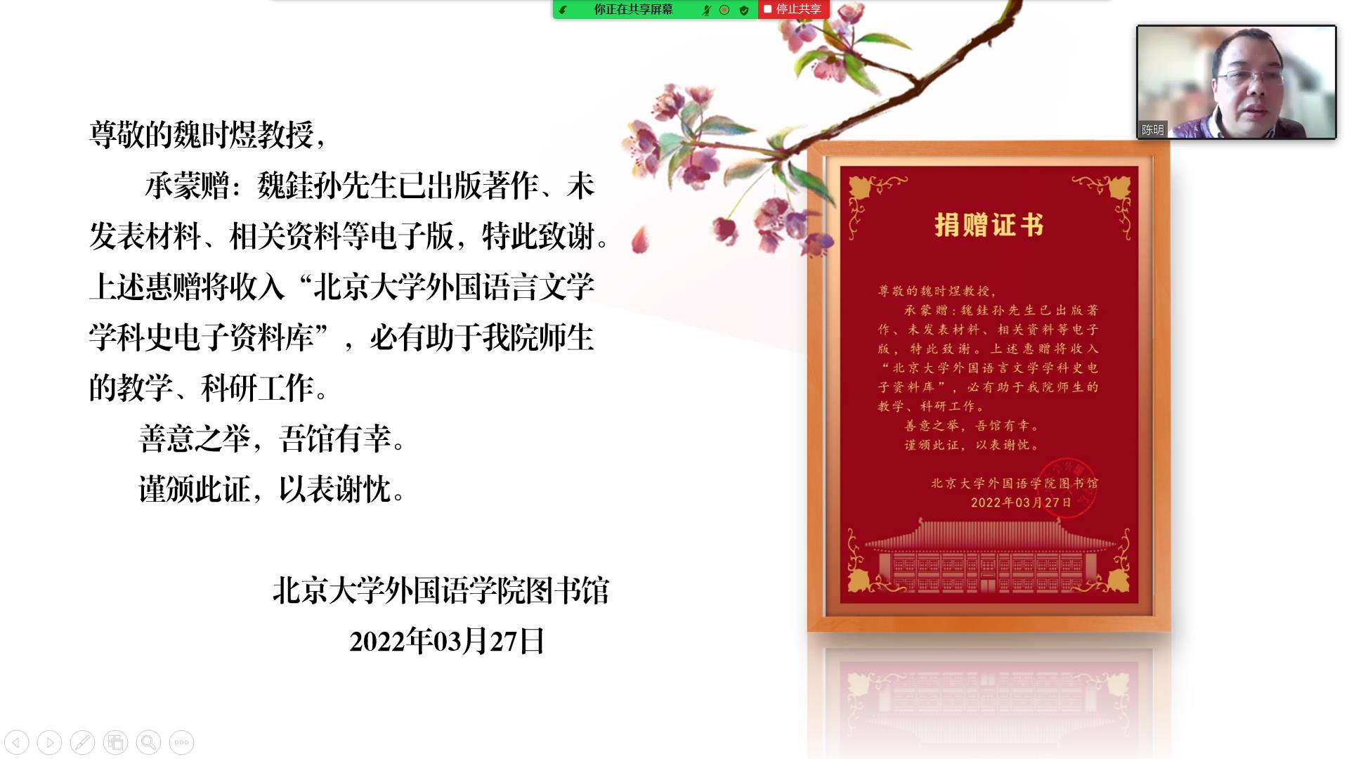 随后,新利·体育院长陈明教授线上为香港城市大学魏时煜教授颁发捐赠证书。陈明教授对魏时煜教授慷慨捐赠魏銈孙先生已出版著作、未发表材料、相关资料等的电子版材料表示感谢。这些资料将收入“北京大学外国语言文学学科史电子资料库”,有助于推动师生的教学和科研工作。