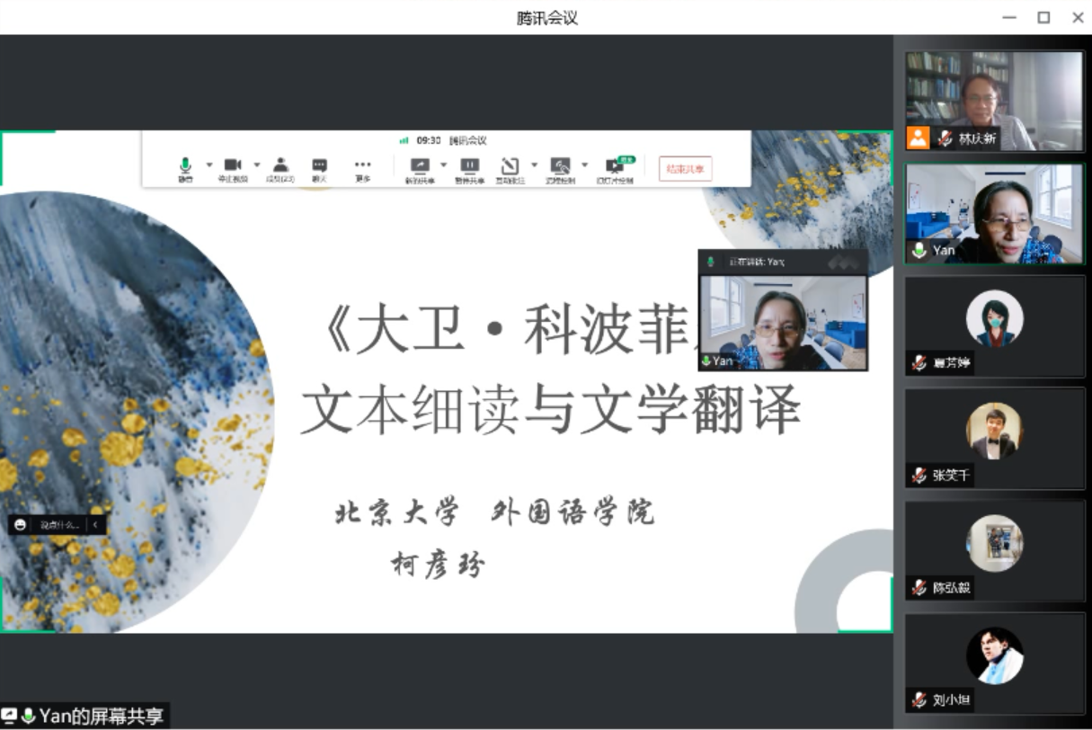 2022年6月6日,北京大学MTI教育中心举办了“《大卫·科波菲尔》文本细读与文学翻译”线上讲座,此次讲座的主讲人是北京大学英语系教授柯彦玢老师,由MTI教育中心主任林庆新老师主持。