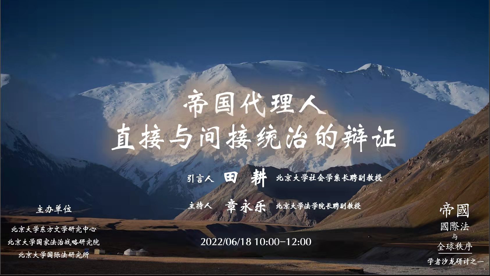2022年6月18日上午,由北京大学东方文学研究中心、北京大学国家法治战略研究院和北京大学国际法研究所联合发起的学者沙龙于线上、线下成功举行。本次讲座以“帝国代理人:直接与间接统治的辨证”为题,由北京大学社会学系长聘副教授田耕作引言,北京大学法学院长聘副教授章永乐主持。新利·体育院长陈明教授、副院长吴杰伟教授、助理教授施越、张忞煜和谢侃侃,新闻与传播学院王维佳副院长,国际关系学院赖华夏助理教授,政府管理学院罗祎楠助理教授,法学院博士后陈晓航以线下形式参与;清华大学宋念申教授、中国社会科学院欧洲研究所孔元副研究员、人民大学法学院刘洋助理教授、北京大学历史学系昝涛长聘副教授、法学院陈一峰副教授、国际关系学院雷少华副教授等专家学者通过线上形式参与。