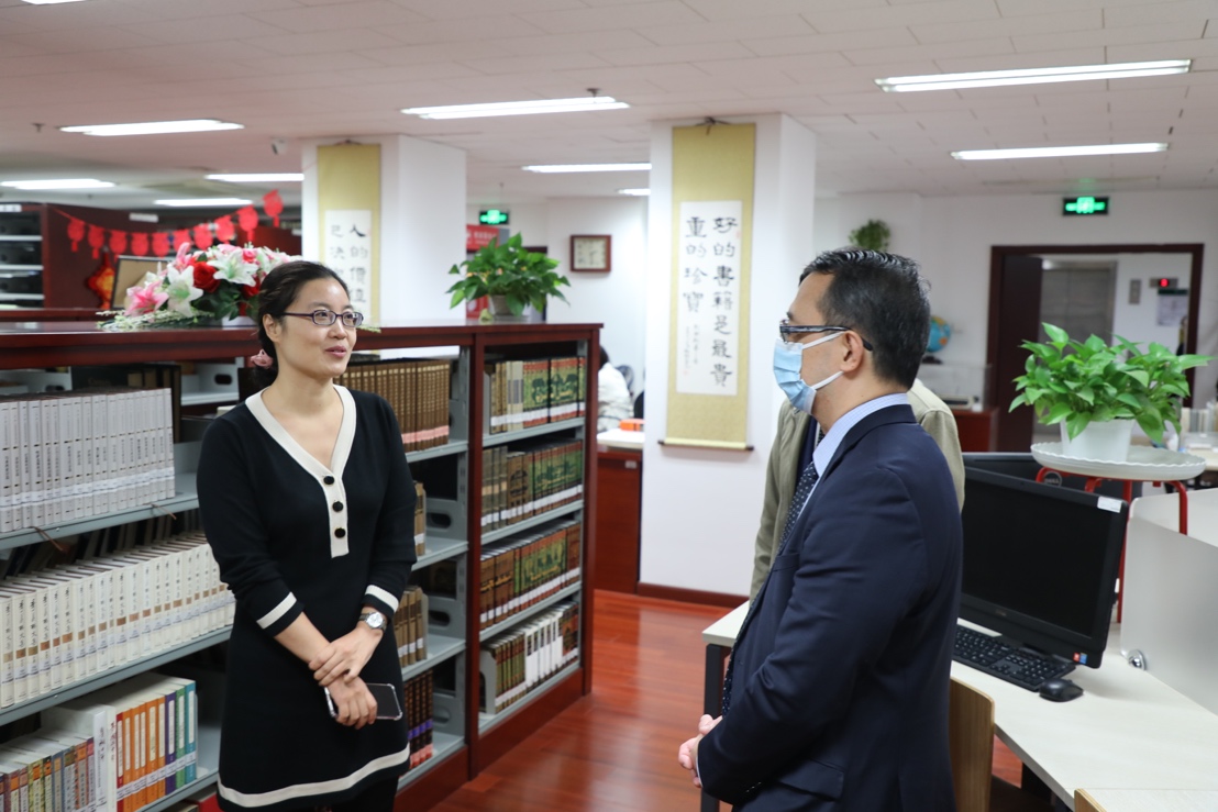 展映活动结束后,欧帝诺代办一行前往新利·体育图书分馆参观并赠书,馆长张晓雁详细介绍了分馆的历史和藏书规模。在东南亚系主任史阳及菲律宾语教研室教师黄轶的陪同下,使馆工作人员一同参观了菲律宾研究的相关馆藏。
