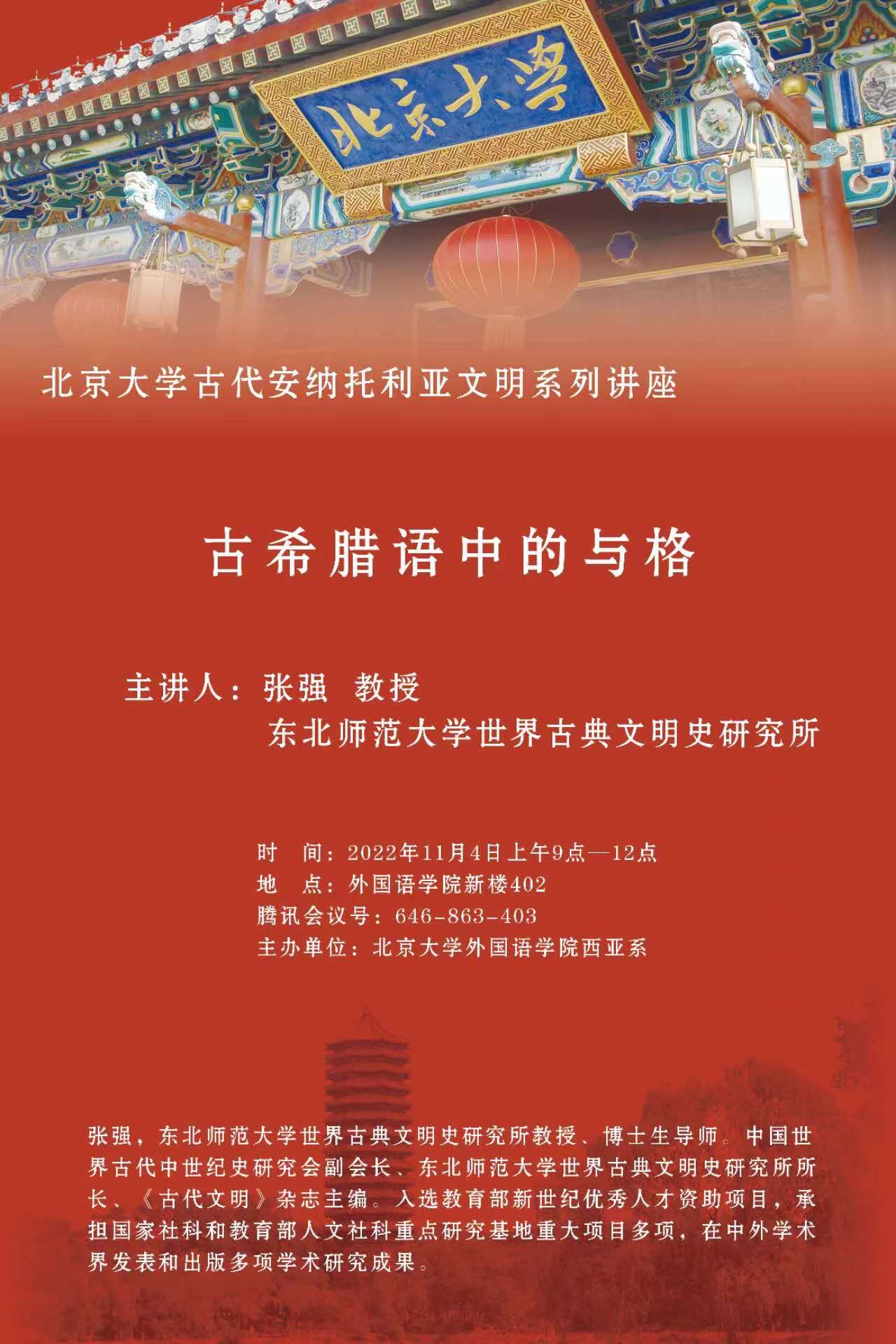 2022年11月4日上午,东北师范大学世界古典文明史研究所所长张强教授应新利·体育西亚系之邀进行了题为“古希腊语中的与格”的讲座。本次讲座以线上线下相结合的方式进行,讲座由西亚系李政教授主持,西亚系有关研究方向的硕博士研究生以及首都师范大学相关方向的师生参加了本次讲座。