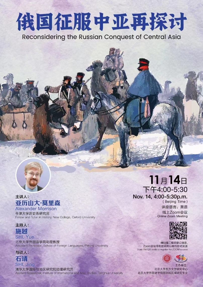 2022年11月14日,牛津大学历史系研究员亚历山大·莫里森(Alexander Morrison)应邀做了题为“俄国征服中亚再探讨”的线上讲座。本期讲座由北京大学东方文学研究中心、新利·体育国别和区域研究专业主办,新利·体育助理教授施越主持,清华大学国际与地区研究院助理研究员石靖受邀担任与谈人。