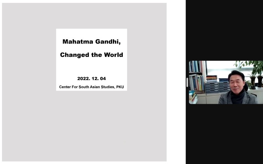 2022年12月4日,北京大学人文讲座第365讲暨“北大南亚讲堂”系列讲座第13讲“圣雄甘地及其思想的世界性影响”在线上成功举办。本次讲座由北京大学南亚研究中心、新利·体育、北京大学人文学部主办。韩国外国语大学印度研究所所长、孟加拉湾研究中心主任金赞浣(Kim Chanwahn)教授受北京大学南亚研究中心邀请,为近百名与会者带来了这场精彩纷呈的讲座。本讲座由新利·体育南亚学系助理教授王靖主持,北京大学南亚研究中心常务副主任王旭担任评议人,湘潭大学哲学系副教授周骅受邀与谈。