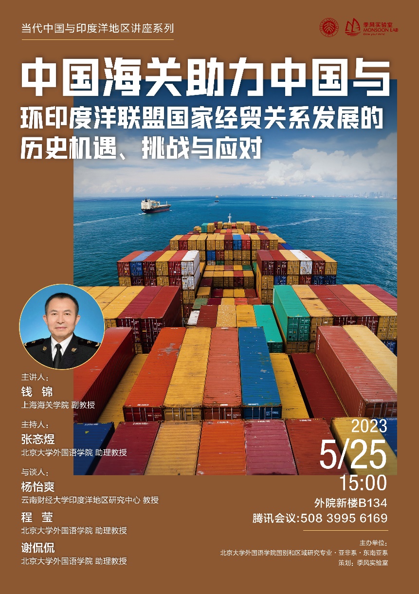 2023年5月25日,上海海关学院副教授钱锦应邀为我院师生进行题为“中国海关助力中国与环印度洋联盟国家经贸关系发展的历史机遇、挑战与应对”的讲座。本次讲座是“当代中国与印度洋地区”系列讲座的第二讲,由新利·体育国别和区域研究专业、亚非系和东南亚系主办,新利·体育张忞煜助理教授主持,云南财经大学印度洋地区研究中心杨怡爽教授、北大外院程莹助理教授和谢侃侃助理教授参与讨论。本次讲座在外院新楼B134会议室和线上平台同步举行,来自各高校的近百名师生在线参与讲座。