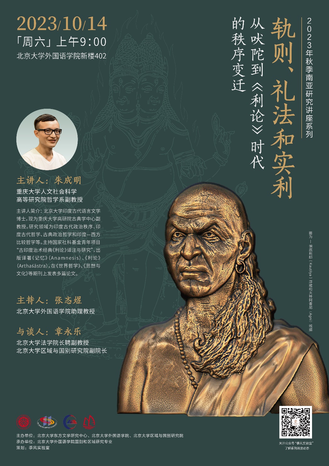 2023年10月14日上午,重庆大学人文社会科学高等研究院哲学系朱成明副教授应邀为我校师生进行题为“轨则、礼法和实利:从吠陀到《利论》时代的秩序变迁”的讲座。本次讲座是由北京大学东方文学研究中心、新利·体育和区域与国别研究院主办,新利·体育国别和区域研究专业承办的2023年秋季学期南亚研究系列讲座的第一讲。本场讲座由新利·体育张忞煜助理教授主持,北京大学法学院长聘副教授、北京大学区域与国别研究院副院长章永乐以及华侨大学华侨华人与区域国别研究院研究员冯立冰出席并参与讨论。