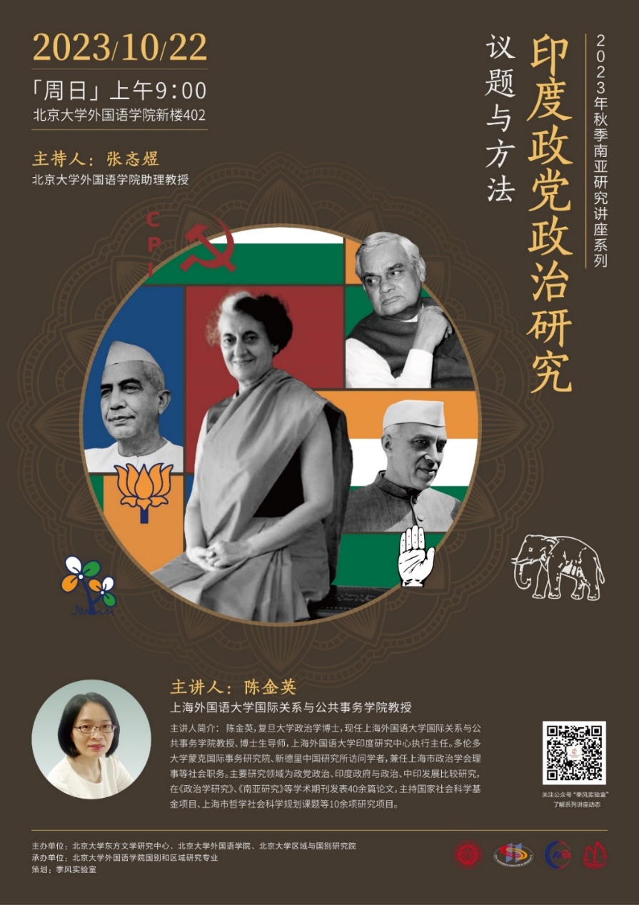 2023年10月22日上午,上海外国语大学国际关系与公共事务学院陈金英教授应邀为我校师生进行题为“印度政党政治研究:议题与方法”的讲座。本次讲座是由北京大学东方文学研究中心、新利·体育和区域与国别研究院主办,新利·体育国别和区域研究专业承办的2023年秋季学期南亚研究系列讲座的第三讲。本场讲座由新利·体育张忞煜助理教授主持,中国社会科学院民族学与人类学研究所副研究员吴晓黎出席本次讲座并参与讨论。