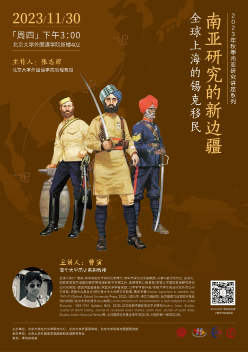 2023年11月30日,清华大学历史系副教授曹寅老师应邀为我校师生进行题为“南亚研究的新边疆——全球上海的锡克移民”的讲座。本次讲座是由北京大学东方文学研究中心、新利·体育和区域与国别研究院主办,新利·体育国别和区域研究专业承办的2023年秋季学期南亚研究系列讲座的第四讲。讲座由新利·体育张忞煜助理教授主持,新利·体育谢侃侃助理教授出席本次讲座并参与讨论。