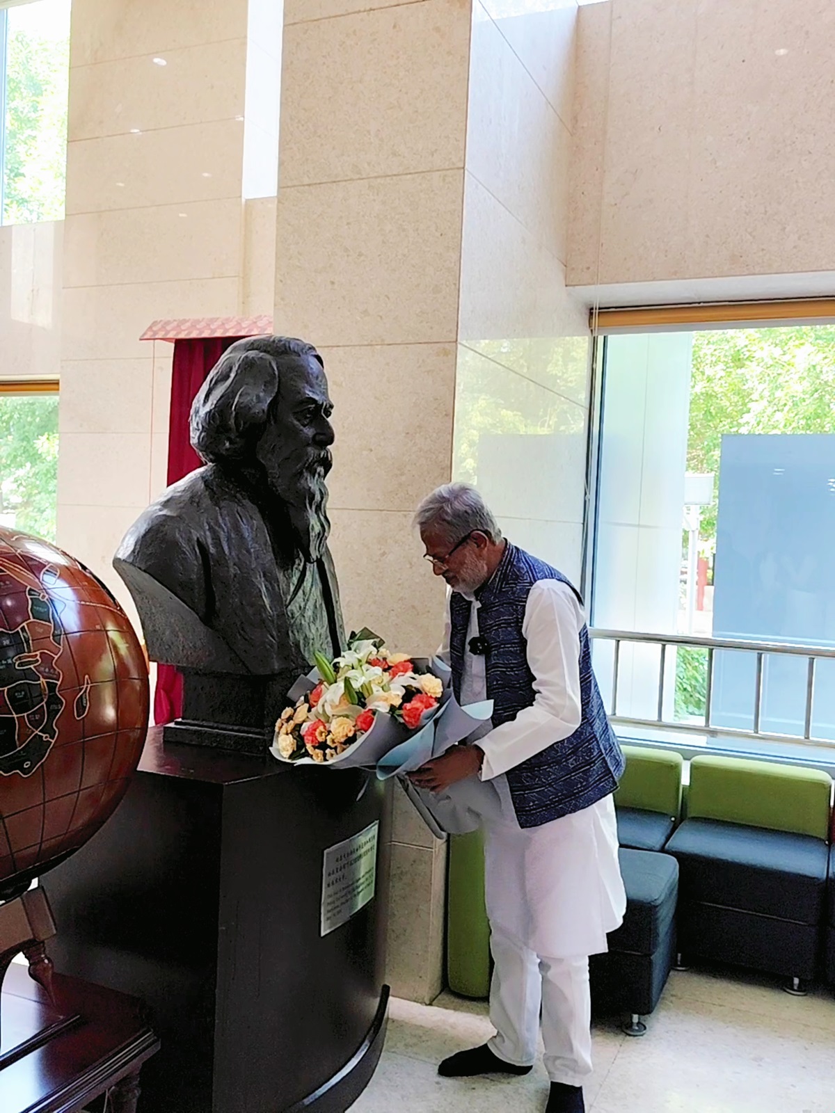 萨卡尔教授怀着崇敬之情向由印度前总统纳拉亚南赠送给北京大学的泰戈尔铜像献上鲜花,并朗诵了自己创作的孟加拉语诗歌《诗歌共和国》和《明镜之城》,以表达对泰戈尔的深切怀念与敬意。王佳亿同学朗诵了诗歌的中文版本。作为回应,杨潇然同学等共同朗诵了泰戈尔的经典诗作《我起了一个中国名字》。