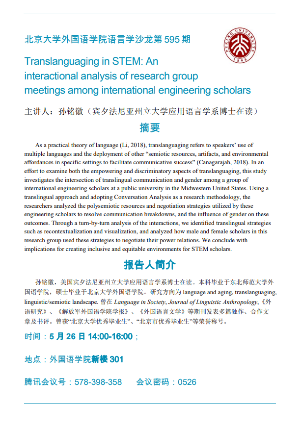 服务导航 新利·体育语言学沙龙第595期:Translanguaging in STEM:An interactional analysis if research group meetings among international engineering scholars 2023-05-21