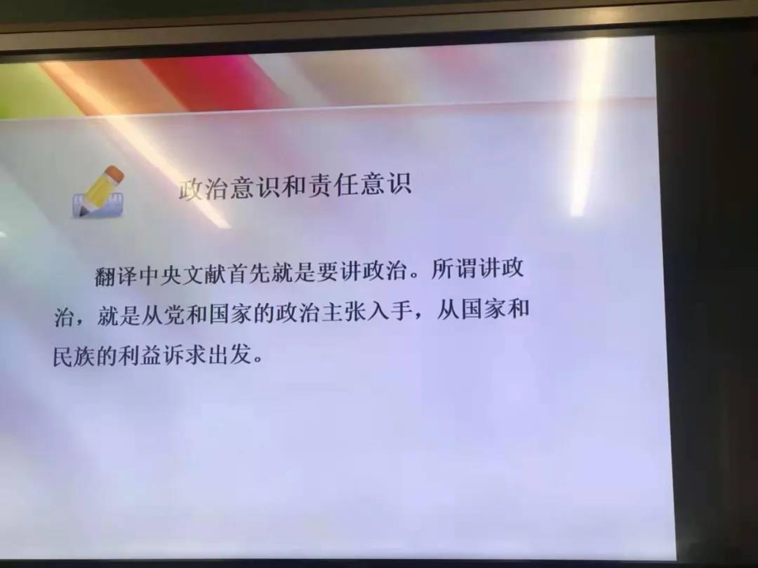 她还强调,同学们在积累的同时,也需要付诸实践。翻译作为一项创造性的语言活动,具有很强的实践性。要明确翻译方向,要积极主动地学习。翻译过程中不断改进学习方法,不断否定自己、不断思考、不断积累,坚持不懈地进步。霍娜最后总结道:中央文献翻译能力的提高并非一朝一夕之事,需要一个长期大量积累的过程。因此,中央文献的翻译工作,要花大量功夫在翻译之外,只有积累到一定量的知识,才能厚积薄发,实现质变,达成飞跃与突破。