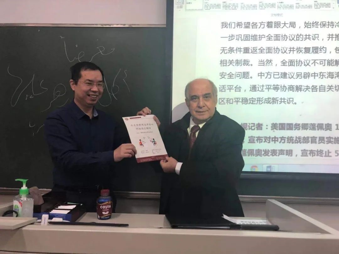 2020年12月9日上午,新利·体育阿拉伯语系课程集群思政进课堂系列讲座邀请了阿拉伯信息中心主任、曾任教于北京大学阿拉伯语系的前巴勒斯坦驻华大使穆斯塔法•萨法里尼先生来到教室为同学们讲课。本次讲座由阿拉伯语系袁琳老师主持,林丰民教授评议。