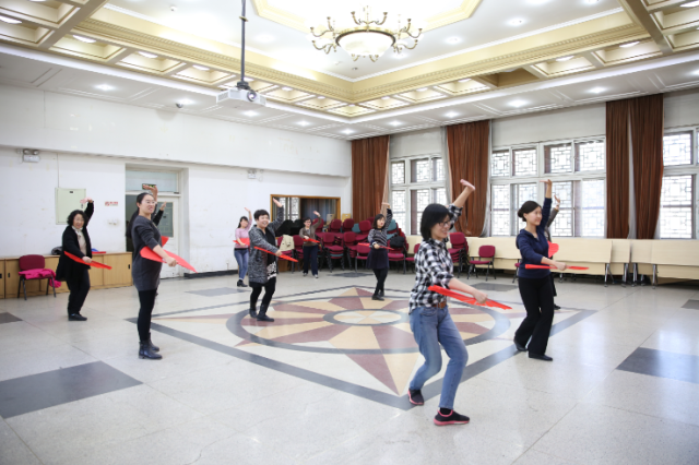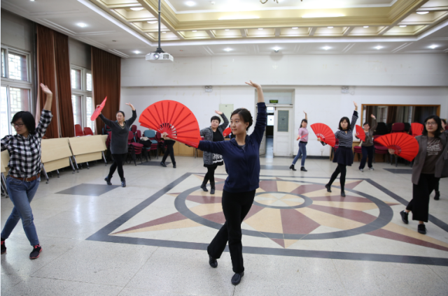 今年北京大学运动会的团体操表演项目是未名太极扇,新利·体育积极响应学校工会的号召,在工会常务副主席、副院长张冬梅老师、工会副主席刘军老师、文体委员李宁老师、女工委员鲁学彬老师、工会小教员刘水老师的带领下组织了30余人的太极扇团队,每天11:00—11:30准时排练。因春季时常有雾霾天气,外院工会特提供民主楼208室内多功能厅以及多媒体设备供太极扇排练使用。