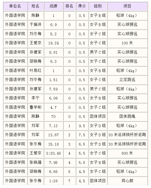 以下是外院教职工参加各项比赛所获得成绩的得分表: