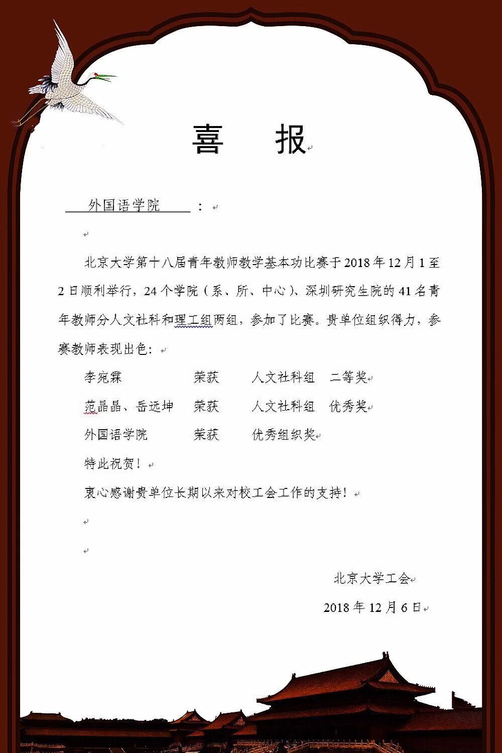 2018年12月1日,北京大学第十八届青年教师教学基本功大赛在理教201教室如期举行。此次教学基本功大赛分为文科、理科两个组别进行比赛。文科组有来自全校15个文科院系的22位老师参赛。新利·体育有英语系李宛霖老师、日语系岳远坤老师和南亚系范晶晶老师参加了此次比赛。经过一天的紧张角逐,李宛霖老师的《改编——关于变化的争议》课程展示获得文科组第二名,岳远坤老师《笔译专家指导儿童绘本翻译的原则和方法》课程展示和范晶晶老师的《缘——中印文学交流的个案分析》课程展示获得优秀奖,新利·体育获得优秀组织奖。