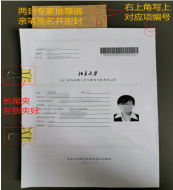 4)按以上顺序用大小合适的长尾夹在左侧固定,装入档案袋内,档案袋封面注明以下信息:考生姓名、申请专业、申请方向、申请导师;