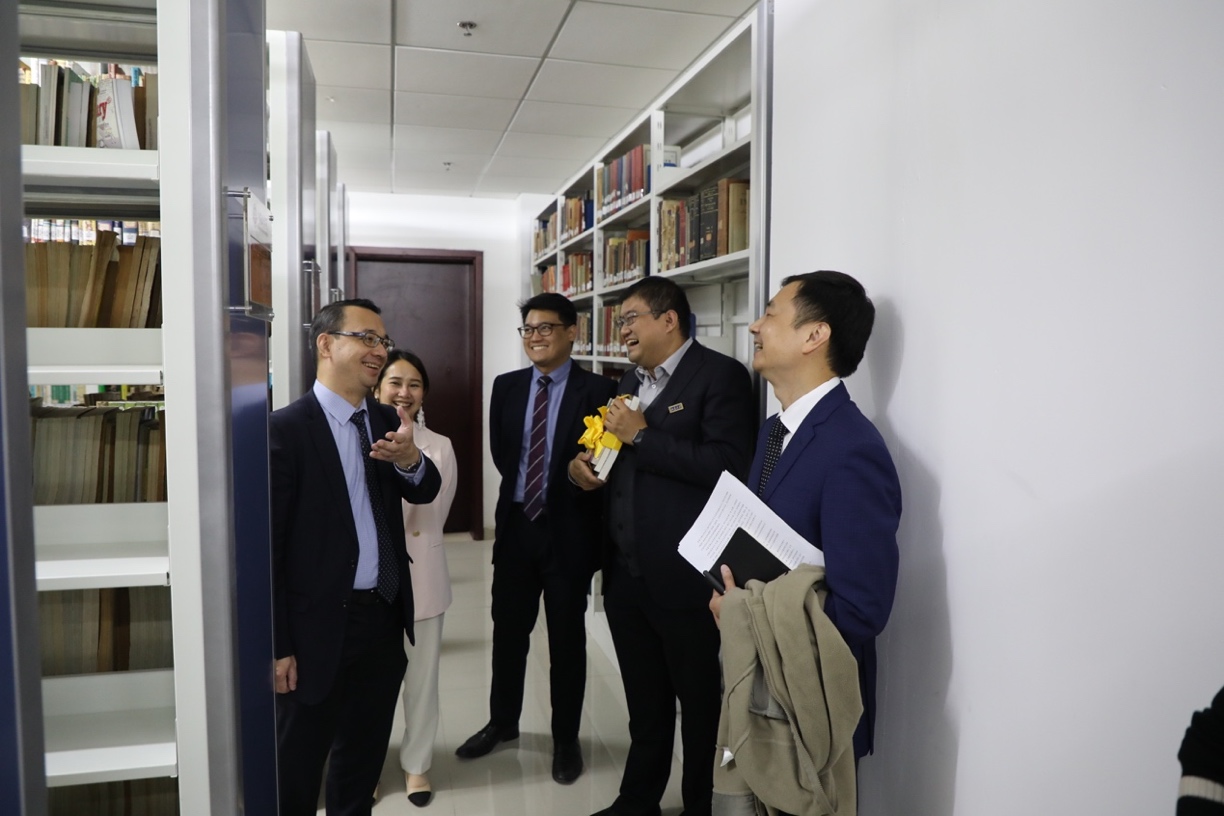 展映活动结束后,欧帝诺代办一行前往新利·体育图书分馆参观并赠书,馆长张晓雁详细介绍了分馆的历史和藏书规模。在东南亚系主任史阳及菲律宾语教研室教师黄轶的陪同下,使馆工作人员一同参观了菲律宾研究的相关馆藏。