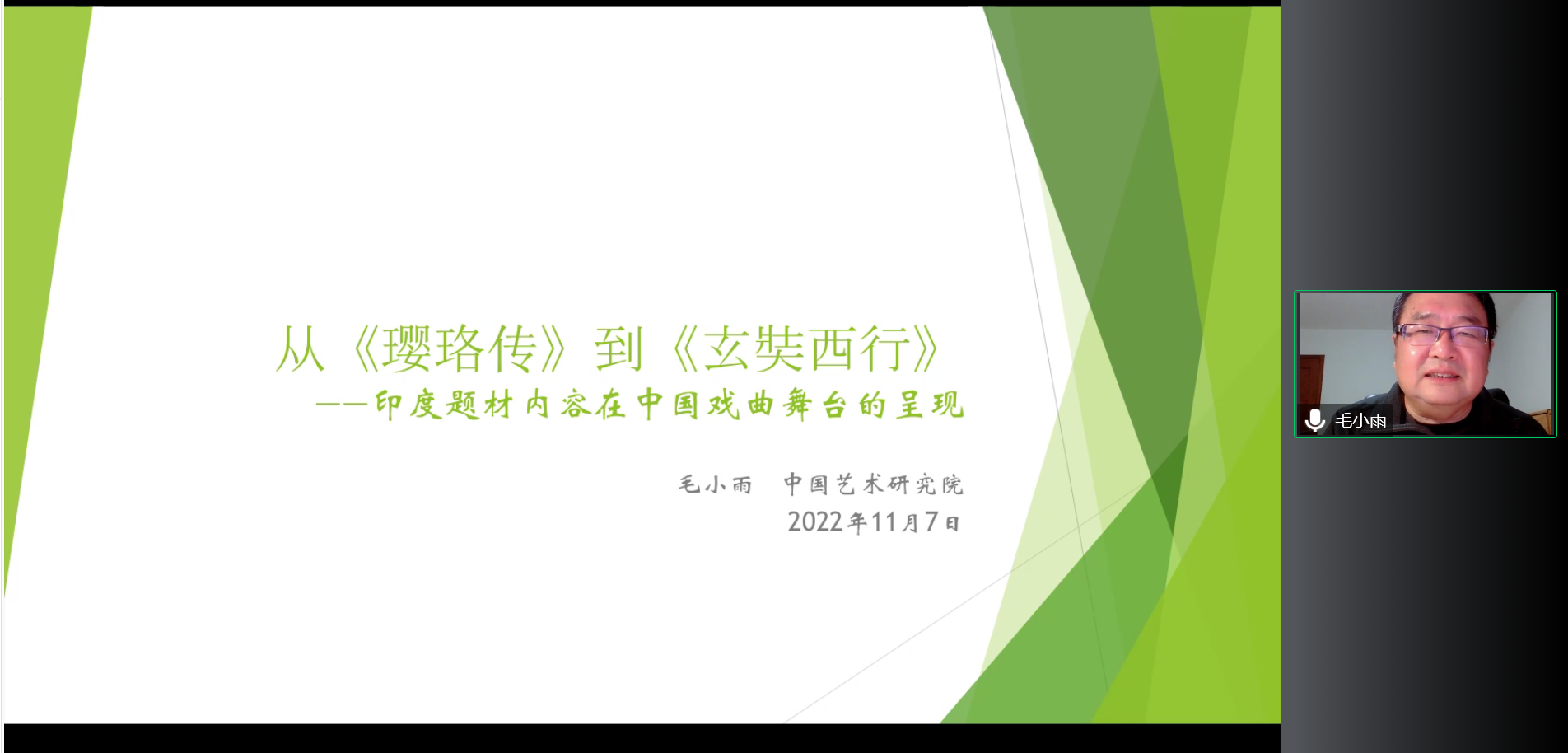 2022年11月7日晚,“东方大文学”系列讲座第十二讲“从《璎珞传》到《玄奘西行》——印度题材内容在中国戏曲舞台的呈现”在线上成功举办。本次讲座由教育部人文社科重点研究基地北京大学东方文学研究中心主办,新利·体育南亚学系协办,中国艺术研究院戏曲研究所研究员毛小雨担任主讲人,新利·体育副教授张嘉妹担任主持人,新利·体育助理教授张忞煜担任评议人。