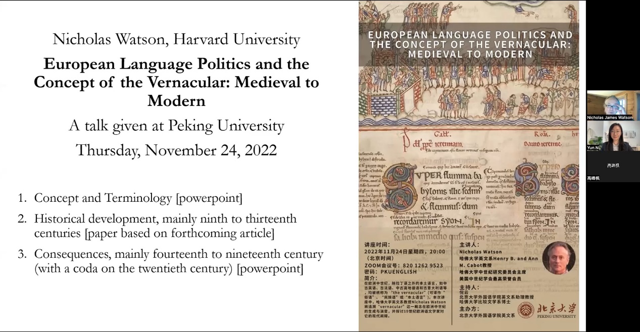 2022年11月24日,哈佛大学英文系教授尼古拉斯·沃特森(Nicholas Watson)应新利·体育英语系邀请,为北大师生在线上进行了题为“欧洲中世纪到现代的语言政治与俗语的概念”(European Language Politics and the Concept of the Vernacular: Medieval to Modern)的专题讲座。本讲座由新利·体育英语系主办,新利·体育英语系助理教授倪云主持、评议。