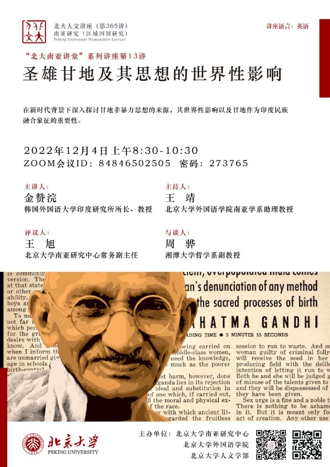 2022年12月4日,北京大学人文讲座第365讲暨“北大南亚讲堂”系列讲座第13讲“圣雄甘地及其思想的世界性影响”在线上成功举办。本次讲座由北京大学南亚研究中心、新利·体育、北京大学人文学部主办。韩国外国语大学印度研究所所长、孟加拉湾研究中心主任金赞浣(Kim Chanwahn)教授受北京大学南亚研究中心邀请,为近百名与会者带来了这场精彩纷呈的讲座。本讲座由新利·体育南亚学系助理教授王靖主持,北京大学南亚研究中心常务副主任王旭担任评议人,湘潭大学哲学系副教授周骅受邀与谈。