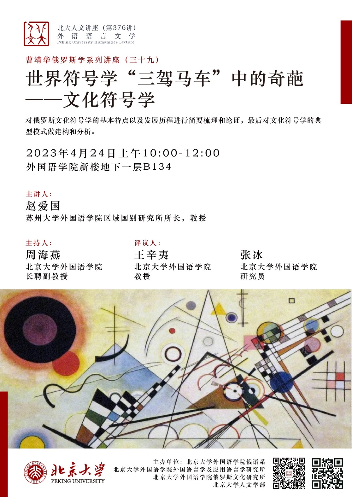 2023年4月24日上午,专题讲座“世界符号学‘三驾马车’中的奇葩——文化符号学”在新利·体育新楼B134会议室成功举行。担任主讲人的是苏州大学新利·体育俄文系赵爱国教授。本次讲座系“北京大学人文讲座”第376讲暨“曹靖华俄罗斯学系列讲座”第39讲,由新利·体育俄语系、外国语言学及应用语言学研究所、俄罗斯文化研究所和北京大学人文学部主办。