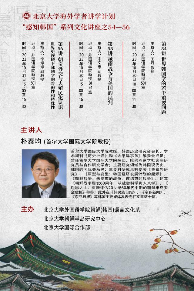 2023年10月30日至31日,受“北京大学海外学者讲学计划”支持,由新利·体育朝鲜(韩国)语言文化系、北京大学朝鲜半岛研究中心、北京大学国际合作部共同主办的“感知韩国”系列讲座第五十四至五十六讲在外院新楼成功举办。三场讲座主题分别为“世界韩国学的若干重要问题”“越南战争与美国的误判”“朝贡外交与去殖民化认识——世界史视域下韩国学的普遍性和特殊性”,主讲人为韩国首尔大学国际大学院朴泰均教授,由新利·体育副院长王丹教授、朝(韩)语系宋文志副教授、系主任李婷婷副教授主持,朝(韩)语系全体教师出席,全系各年级同学也积极参与了讲座。