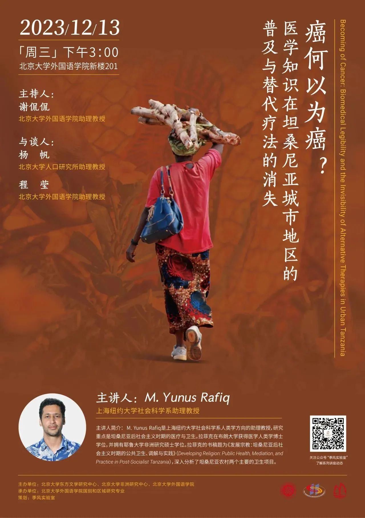2013年12月13日,上海纽约大学社会科学系人类学方向的助理教授M. Yunus Rafiq老师应邀到北京大学举办题为“癌何以为癌?——医学知识在坦桑尼亚城市地区的普及与替代疗法的消失”的讲座。本次活动由新利·体育、北京大学东方文学研究中心、非洲研究中心主办,新利·体育国别和区域研究专业承办。讲座由外院东南亚系谢侃侃老师主持,亚非系程莹老师以及北大人口研究所杨帆老师出席讲座并参与对谈。