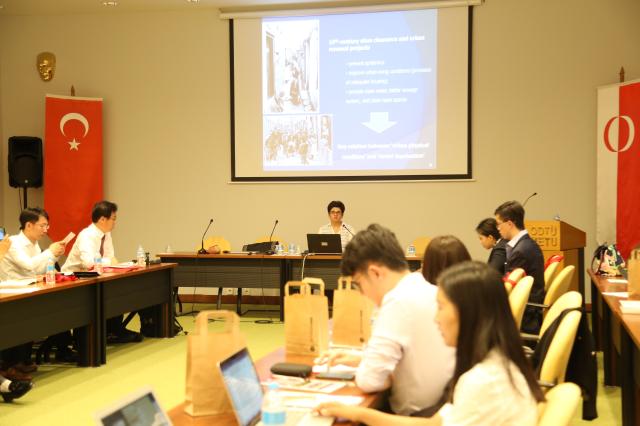 在土耳其,代表团参访了大学、智库等当地学术机构。8月26日,代表团师生应邀访问了位于土耳其首都安卡拉的中东科技大学,听取了来自经济系的席琳•萨拉古鲁教授(Sirin Saracoglu)、城市与地区规划系的姆格•阿喀尔•厄尔姗教授(Muge Akkar Ercan)和国际关系系的谢利夫•奥努尔•巴切科副教授(Serif Onur Bahcecik)所做的“土耳其经济与土中经济关系”、“土耳其城市改造”、“一带一路与土中关系”三场讲座。其中,Serif教授着重梳理了中土关系发展的历史,并进一步介绍了土耳其目前外交政策的基本立场,表示土耳其现在正在积极寻求与包括俄罗斯和中国在内的东方国家进行合作,希望能以“中部走廊”战略与“一带一路”对接,使土中关系迎来一个更为稳健的发展阶段。