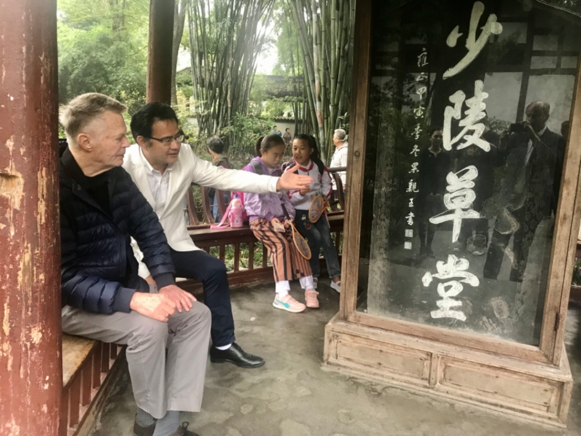 董强在杜甫草堂现场为勒克莱齐奥讲解杜甫