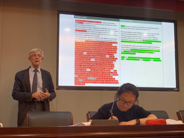 四场讲座得到了法语系全体师生的热烈欢迎。每场讲座均有中文翻译。由于每场讲座都是跨系、跨学科合作,许多外系学生、外校教师也慕名前来。5月16日下午,Didier Alexandre教授还参加了法语系中法联合培养的博士答辩,法语系博士生陆一琛顺利通过了北京大学和法国巴黎索邦大学的博士答辩,为Alexandre教授紧凑、充实的北大之行增添了一项重要内容。