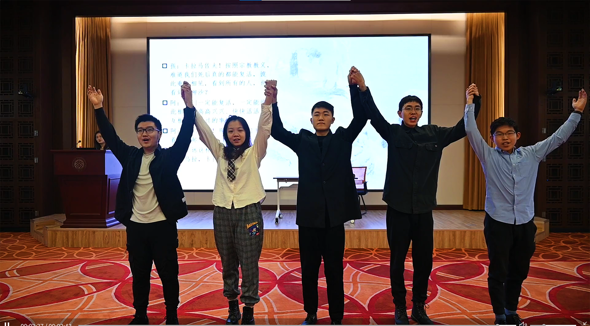 由新利·体育俄罗斯语言文学系同学排演的三幕话剧«Раскольник и др.»(《拉斯柯尔尼科夫一众》)是本次活动的第五个节目。整部剧时长约十六分钟,《地下室手记》《罪与罚》《群魔》《荒唐人的梦》《卡拉马佐夫兄弟》中的主人公们轮番登场,他们在惶恐焦虑、急切不安的状态下爆发,以难以遏制的激情直抒胸臆。通过他们的表演,观众可以理解陀氏人物的内心世界,体会他们在思想上的传承、在观念上的碰撞。每幕仅五六分钟的话剧,布景道具要而不繁,汇聚传统手法和现代风尚,有力呈现了陀氏作品的精神内涵。
