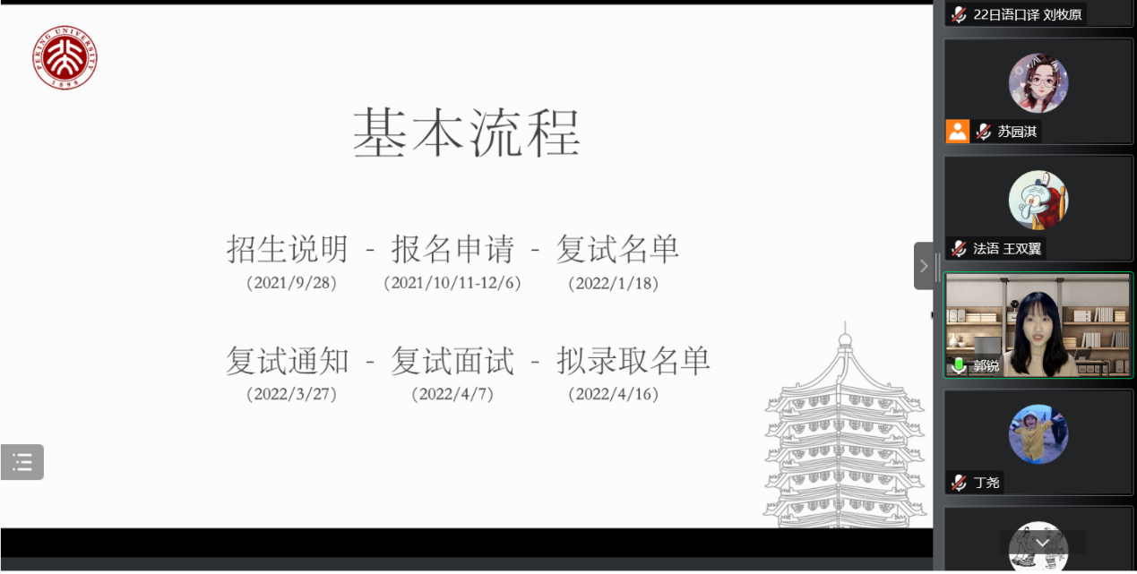 郭锐根据个人申请的经历,从前期准备、材料初审和复试面试三个方面对博士申请、考核的基本流程进行讲解。在前期准备方面,她建议大家积累研究经验,构思研究方向,最好提前联系心仪的导师。针对初审材料,郭锐以学院网站发布的“申请-考核”制博士研究生招生说明为例进行详细解读。关于复试面试,郭锐强调语言基础、专业知识和研究能力是本专业考察的核心部分,并就如何应对面试提出了诸多建议。