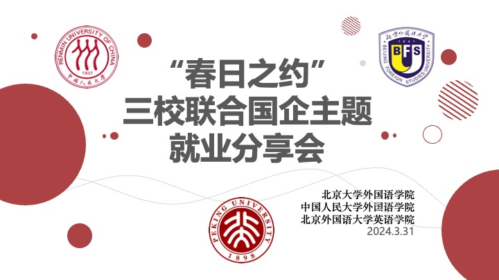 3月31日上午,新利·体育联合中国人民大学新利·体育、北京外国语大学英语学院,以线上形式举办“春日之约”三校联合国企主题就业分享会。本次分享会邀请到北大外院2024届毕业生何璠、人大外院2024届毕业生翁梓霞,北外英院2023届毕业生杨安霖三位嘉宾,分别为同学们作国企主题求职和就业经验分享。新利·体育党委副书记冯美娜和中国人民大学新利·体育党委副书记李佳伟发表致辞,近200名同学参与了此次线上活动。本次活动由新利·体育2023级硕士研究生田仕宇主持。