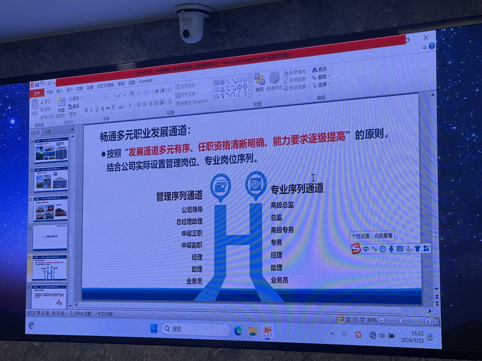 紧随其后,中船贸易人力资源部主任详细介绍了中船贸易基本情况,从公司架构、业务范围到人才发展体系,向北大师生们揭开了中船贸易的神秘面纱。中船贸易拥有广泛的全球业务网络,具体表现为防务产业、船海产业、科技应用产业的多元化业务布局。其下设有9个驻外代表处和2个维保站,覆盖关键国际市场,确保了及时响应客户需求与提供高效服务。同时,通过独资、控股或管理的12家企业,公司实现了业务多元化与国际化运营。她强调,中船贸易注重人才培养与激励,致力于构建公平、透明的职业晋升机制,按照“发展通道多元有序、任职资格清晰明确、能力要求逐级提高”的原则,结合公司实际,设置管理岗位、专业岗位序列,提供从见习期至高级总监的多层次发展路径,并配套落实“为岗位(Position)付薪、为能力(Power)付薪、为业绩(Performance)付薪”的薪酬体系。同时,中船贸易也构建了全方位、高标准的福利保障体系,包括瑜伽健身区、人身保险等,充分体现了公司对员工的关怀与激励。