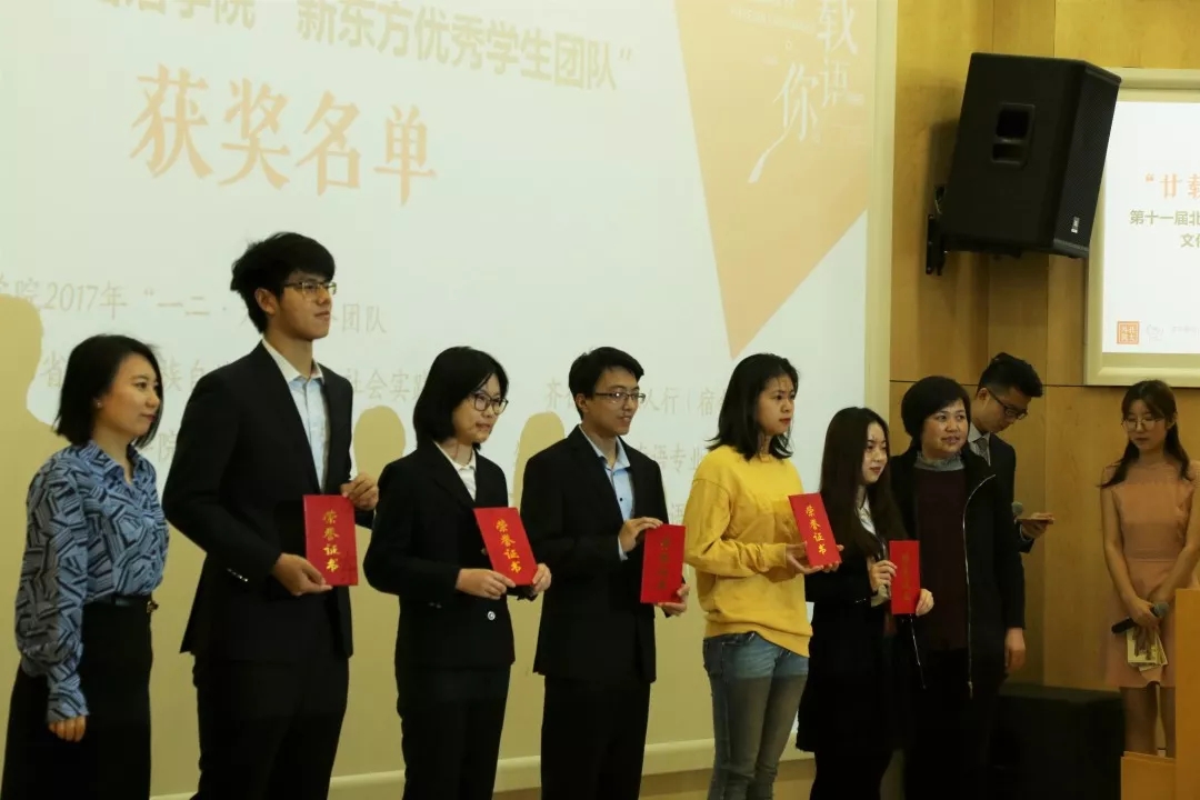 接下来进行的“新东方优秀学生团队”颁奖仪式中,10支获奖团队代表上台领奖,李淑静、高静、付志明、宋扬上台为获奖代表颁奖。之后,“新东方优秀学生团队”获奖团队代表、新利·体育2018级亚非语言文学硕士研究生许洋分享东南亚华文教育调研小组团队实践收获。