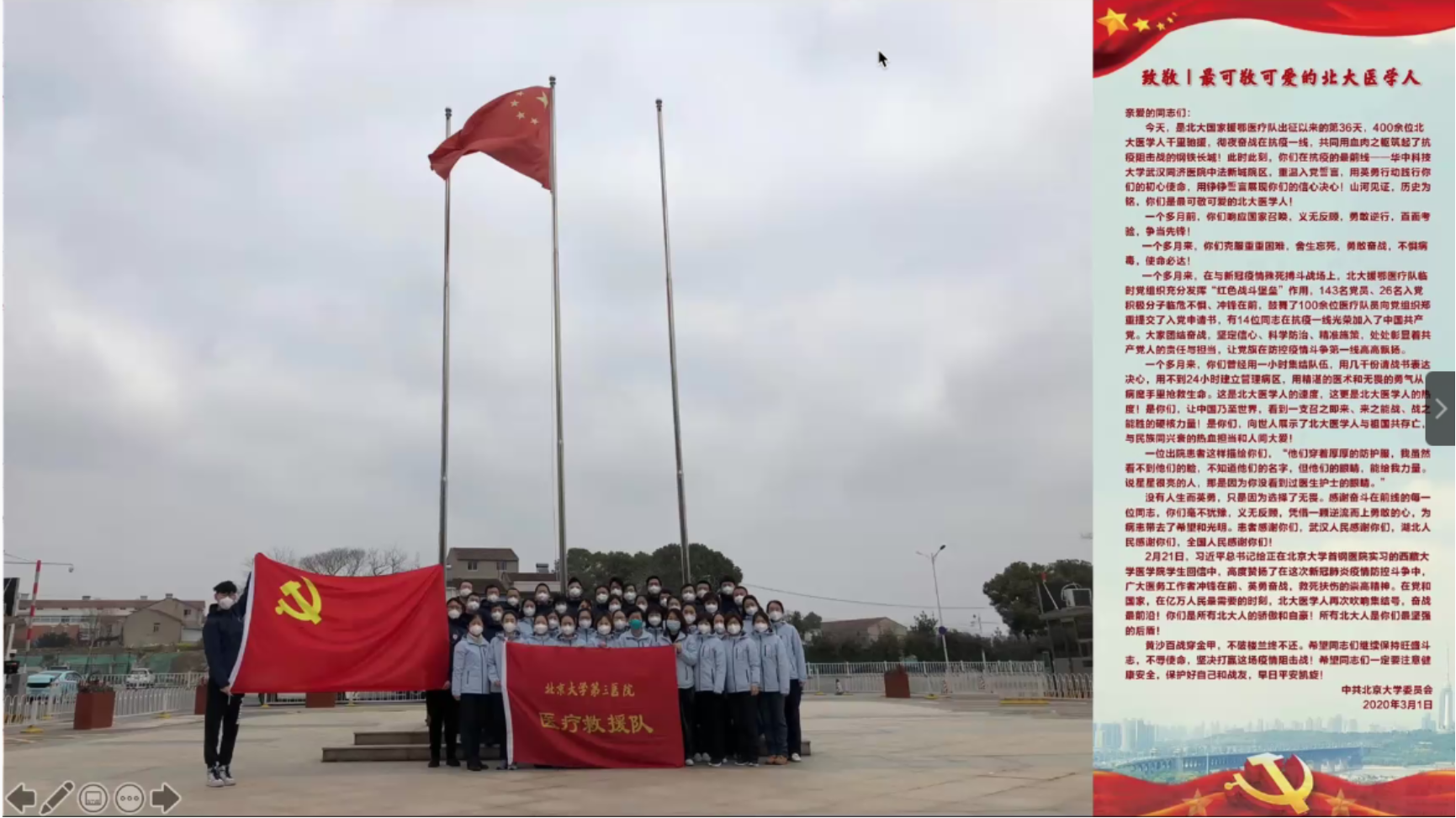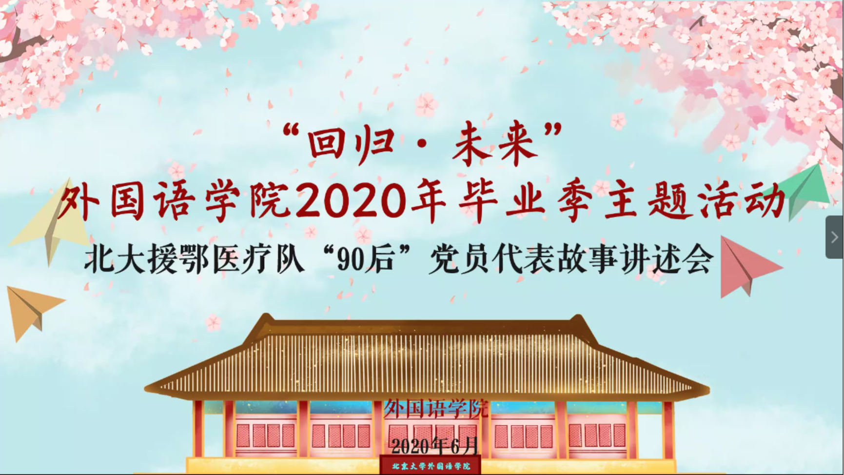 6月23日晚,新利·体育通过线上的方式举办了“回归·未来”新利·体育2020年毕业季主题活动,给毕业生们上了毕业的最后一节公开课。会上特别邀请到北京大学援鄂医疗队“90后”党员代表、北医三院医务处庄昱老师分享他在援鄂期间的经历,以及习总书记回信背后的故事。新利·体育党委书记李淑静老师、党委副书记王恒老师,以及毕业年级、非毕业年级的同学们共同参加了此次活动。活动由新利·体育团委书记卢敏老师主持。