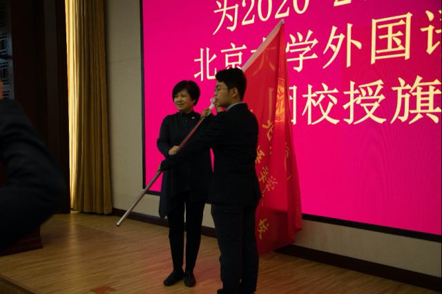 在全体学员的见证中,李淑静老师为新一届团校授旗,新生代表李泽明同学接过旗帜,象征着接力棒交到了新一届团校学员手中。