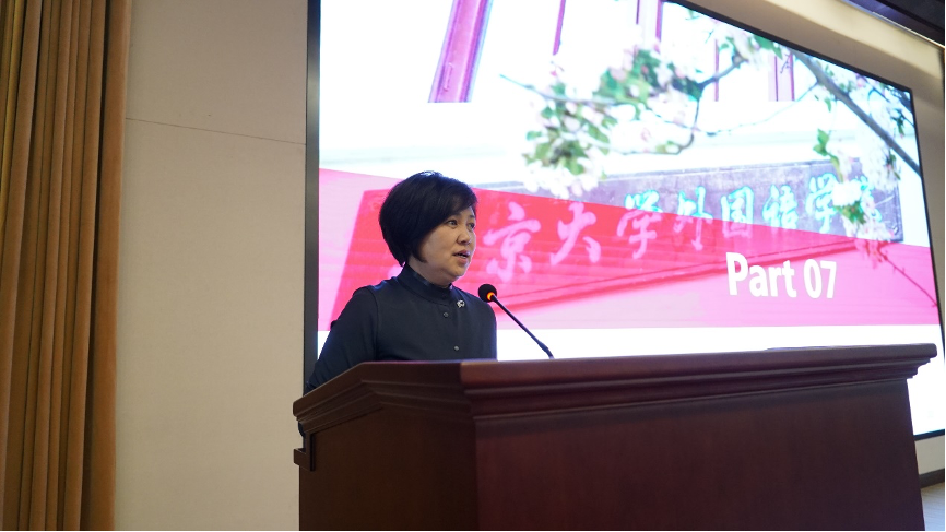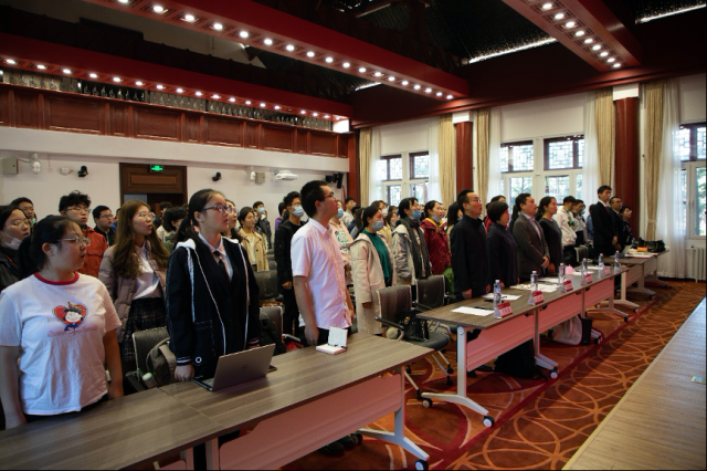 李淑静老师首先感谢校团委对外院团学工作的大力支持,并对上一学年外院团校的工作给予了充分肯定。李老师向同学们提出了三点希望:一是热爱祖国、坚定理想,她结合疫情期间外院师生、校友的辛勤工作和突出贡献,带大家体悟了“爱国是立德之源、立功之本”的深切内涵;二是指出外语学习需要不断磨练,要求同学们勤学笃实、求真力行,利用综合性资源和实践机会,积极学习有利于国家发展的知识技能;三是希望大家团结奋进、守望互助,在团校学习中广结益友,提升集体凝聚力,带动青年们奋发向上。