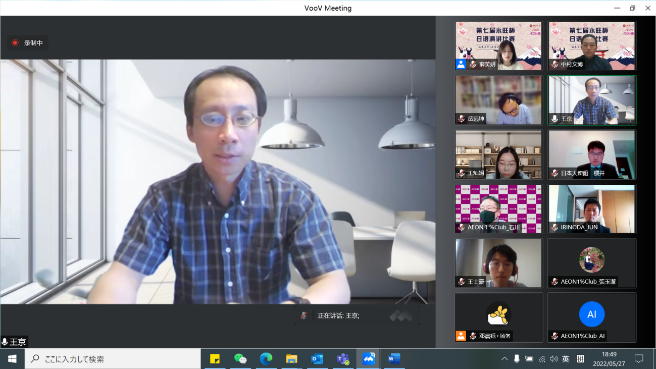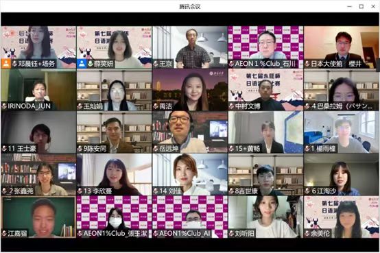本届“永旺杯”采用线上会议的比赛模式,邀请校内外的日语专家们出席并担任嘉宾及评委。日本国驻华大使馆公关文化中心二等秘书樱井真一、公益财团法人永旺1%俱乐部事务局次长石川忠彦、永旺商业有限公司总经理入野田润、北京大学教育基金会项目管理部部长禹洁、新利·体育日本语言文化系副教授王京、助理教授岳远坤、王灿娟出席本次比赛。