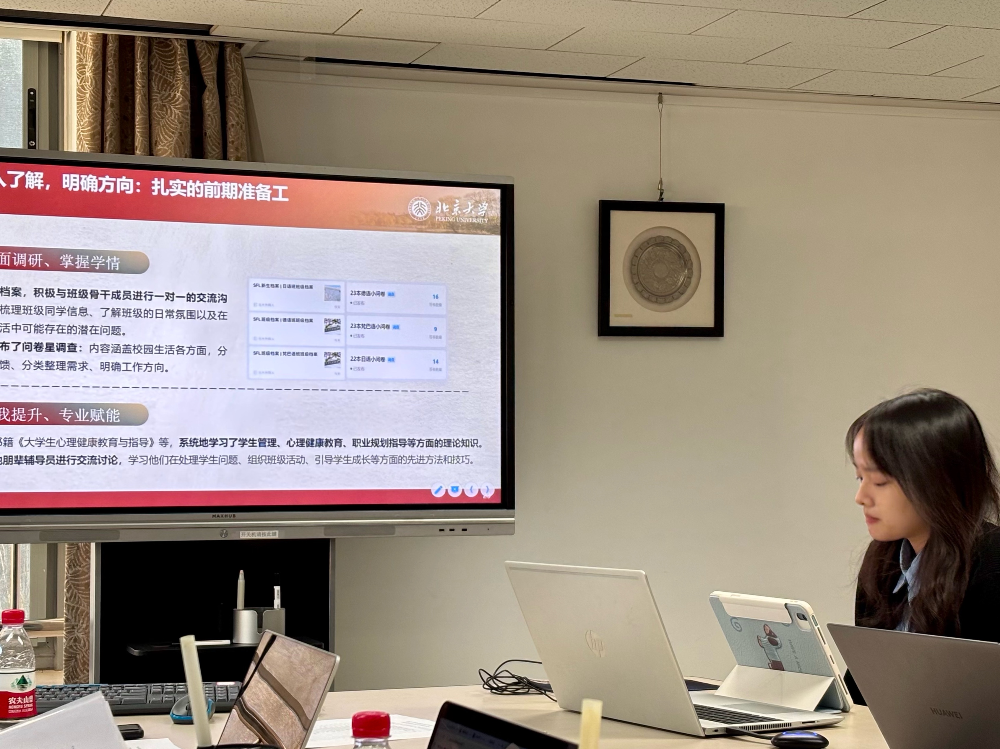 首先,带班辅导员依次进行述职。他们分别介绍了所带班级的基本情况,总结了本学期开展谈心谈话、参加班团活动、参与心理技能培训等工作内容,展示了个人的特色创新工作。同时,带班辅导员们也对寒假和春季学期的工作做出了规划与展望,包括优化工作思维,凸显思政引领价值;立足同学所需,持续做好深度辅导;注重示范引领,创新集体活动形式;加强朋辈交流,推动带班辅导员之间的互动学习等。