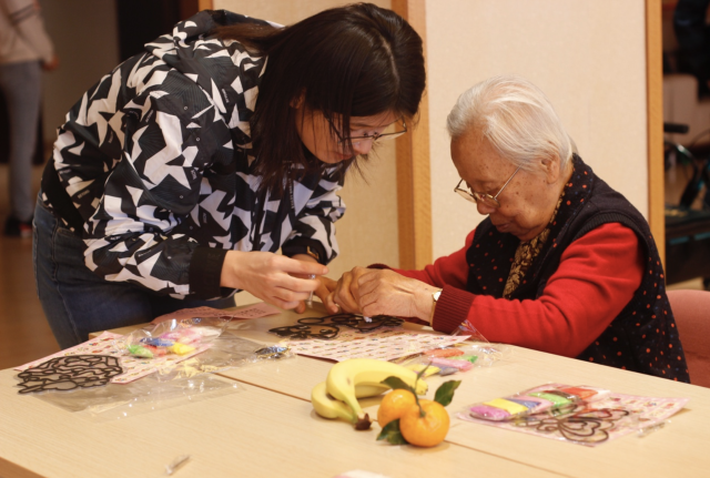 表演圆满落幕,志愿者开始与老人们合作制作精美小手工。在志愿者们的帮助下,老人们将画布上色,做成了一幅幅漂亮的珍珠泥染色画。看到自己亲手完成的作品,老寿星们都乐开了花。而合作的过程也是沟通的过程,志愿者听爷爷奶奶们讲述过往人生、诉说嘱托期许,心中不由升起尊敬与钦佩,也对未来倍感自身责任。