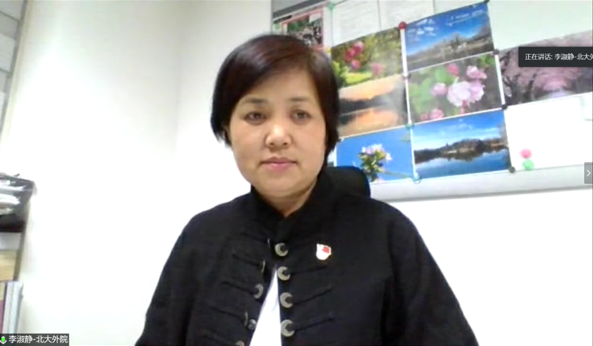 李淑静表示,武大外院在抗疫工作中的宝贵经验值得学习,突出的成果令人赞赏。北大外院鼓励学生积极投身防疫工作,发挥专业优势,为防疫中的国际合作架起桥梁。在看到总书记的回信以后,北大外院师生认真组织学习,分享学习体会,在每个人心中留下了深深感动。李淑静指出,在全球疫情形势日益严峻之时,希望双方学子以坚定的理想信念擦亮共产党员的底色,坚持共产党人的精神追求和理想信念;以扎实的专业特长彰显外院学子风采,顶得住压力,扛得起责任,做得到承诺;在相互砥砺的实践中激扬青春力量,书写青春篇章,成长为“堪当大任”的好青年。李淑静表示,虽然两院学子天各一方,但都在用年轻的肩膀扛起自己的责任,共同为抗疫工作作出了自己的贡献,展示了外院人的专业力量和优秀风貌。她期待此次共建活动能够巩固两院友谊,带领两支“外院人”的队伍不断前进。