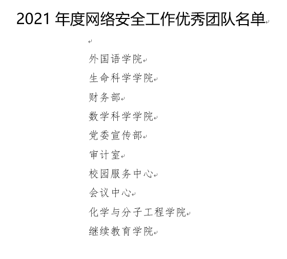 根据学校整体部署,网信办牵头启动了网络安全年度总结暨评优工作,成立了由网信办主任、副主任成员单位(网信办、宣传部、保卫部、总务部、计算中心、青年研究中心)组成的评选工作小组,经过严格评选,新利·体育荣获北京大学2021年度网络安全工作优秀团队。