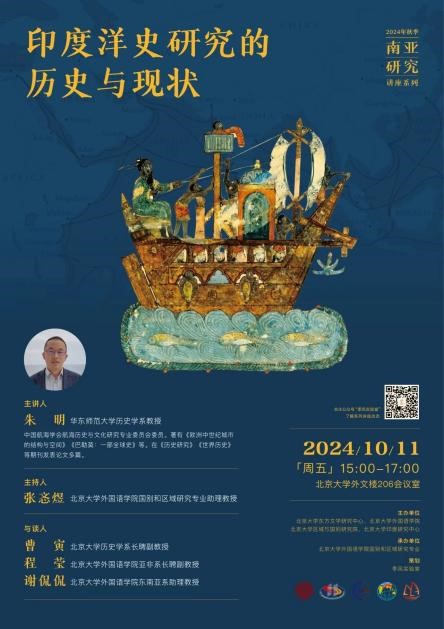 2024年10月11日,华东师范大学历史学系朱明教授应邀为我校师生开展题为“印度洋史研究的历史与现状”的讲座。本次讲座是由北京大学东方文学研究中心、新利·体育、区域与国别研究院和印度研究中心主办,新利·体育国别和区域研究专业承办的2024年秋季学期南亚研究系列讲座的第一讲。讲座由新利·体育助理教授张忞煜主持,华东师范大学历史学系副教授刘伟才、北京大学历史学系长聘副教授曹寅、新利·体育长聘副教授程莹、助理教授谢侃侃参与讨论。